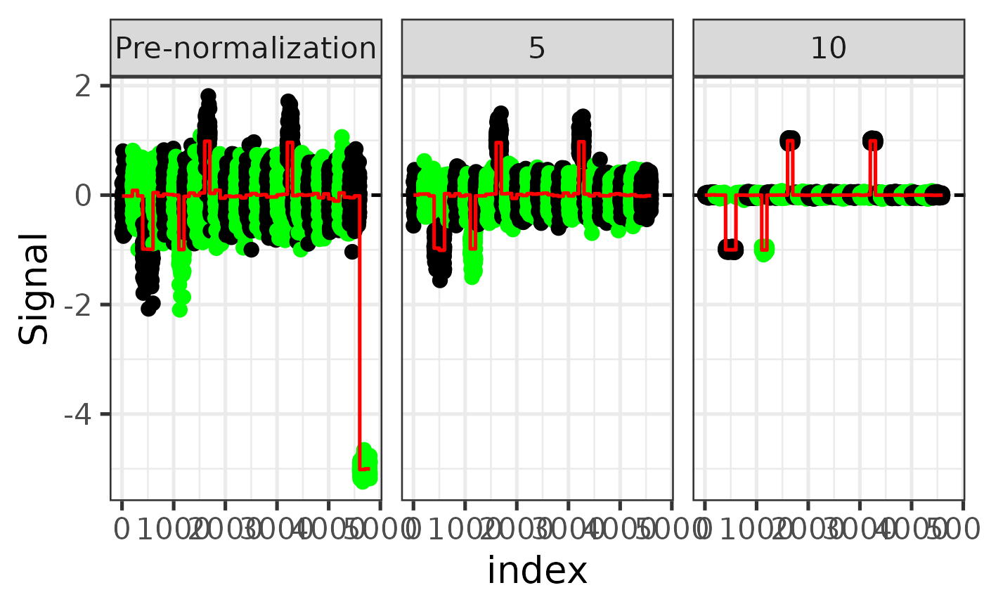 (Invisibly) A ggplot object containing the signal profiles for the sample before and after normalization.
